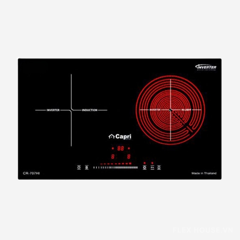 Bếp điện từ hồng ngoại 2 vùng nấu Capri CR-707HI là dòng bếp điện từ kết hợp hồng ngoại âm đôi cao cấp của thương hiệu Capri – Italy, được sản xuất tại Thái Lan theo tiêu chuẩn công nghệ châu Âu. Với thiết kế tinh tế, mặt kính vát 4 cạnh sang trọng và hàng loạt tính năng thông minh, CR-707HI mang đến sự tiện nghi, hiệu quả và an toàn tuyệt đối cho gia đình hiện đại.