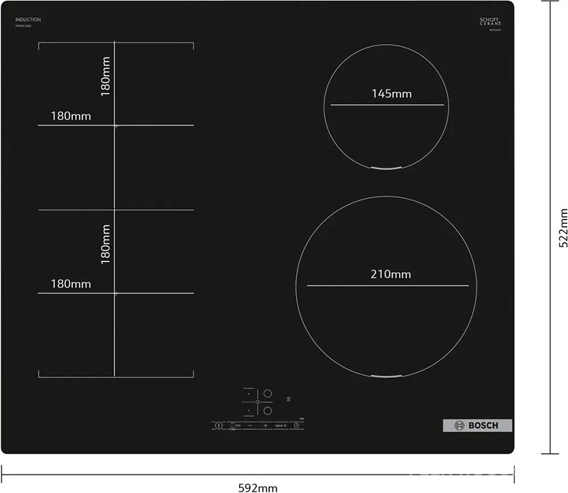 Bếp từ Bosch HMH.PWP611BB5E xuất là sự kết hợp hoàn hảo giữa hiệu suất mạnh mẽ, thiết kế sang trọng và tính năng thông minh, giúp nâng cao trải nghiệm nấu nướng và tối ưu không gian bếp. Sở hữu thiết kế lắp âm tinh tế, bề mặt kính gốm thủy tinh cao cấp màu đen bóng bẩy, bếp không chỉ dễ dàng vệ sinh mà còn mang đến vẻ đẹp hiện đại cho gian bếp. Bảng điều khiển cảm ứng TouchControl +/- giúp người dùng thao tác nhanh chóng, dễ dàng điều chỉnh mức công suất chỉ với một chạm nhẹ.