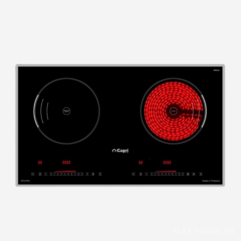 Bếp từ kết hợp hồng ngoại Capri CR-678HI là dòng bếp điện từ kết hợp hồng ngoại âm đôi cao cấp, thuộc thương hiệu Capri – Italy, sản xuất tại Thái Lan theo tiêu chuẩn châu Âu. Với thiết kế tinh tế, mặt kính vát 4 cạnh sang trọng, sản phẩm mang đến sự hiện đại, tiện nghi và an toàn cho không gian bếp.
