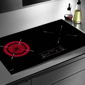 - 02 mặt bếp nấu: 01 bếp từ có vòng nhiệt Ø210mm; 01 bếp điện vitroceramic có vòng nhiệt đôi Ø 120/190mm.